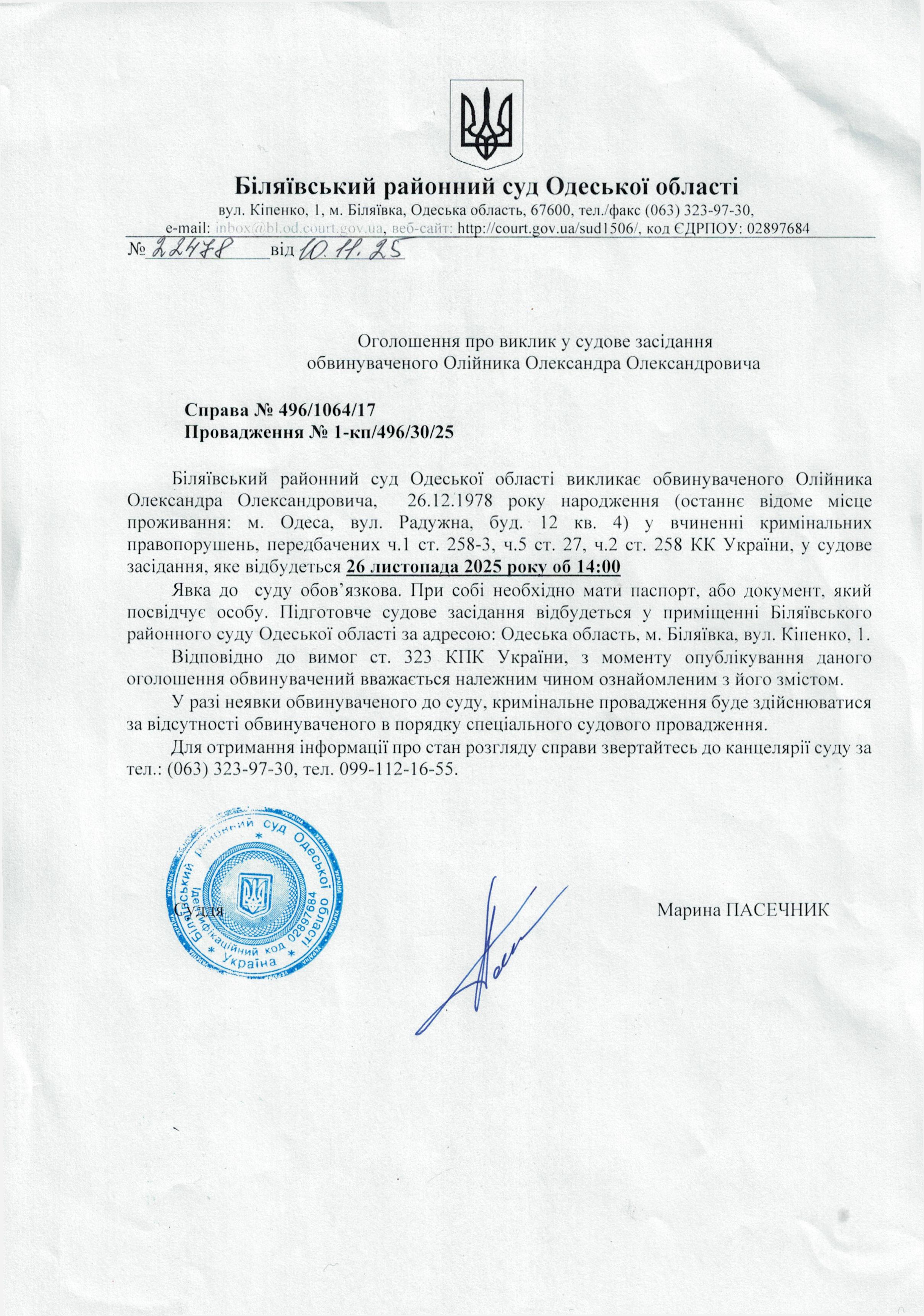 Оголошення про виклик у судове засідання обвинуваченого Олійника О.О.